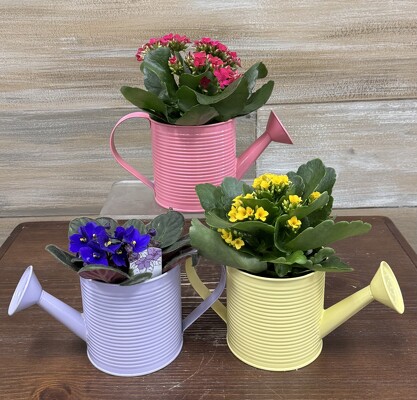 4IN BLOOMING PLANT FEATURED IN VARIETY OF COLORS AND IN A METAL WATERING CONTAINER. WILL SEND IN STOCK CONTAINER AND BLOOM COLOR